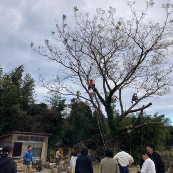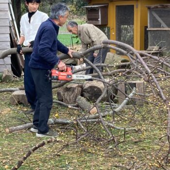 日之影町からサン・ビレッジのアキオさん、登場!見事なチェーンソーさばきの後、プチ講習会をしてくれたり、目立てをしてくれたり。