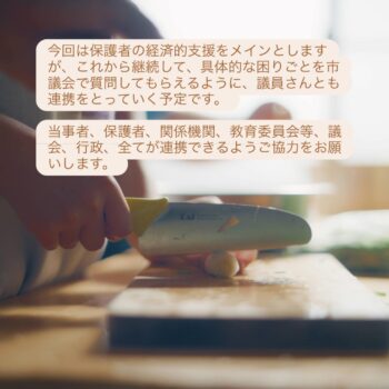 今回は保護者の経済的支援をメインとしますが、これから継続して、具体的な困りごとを市議会で質問してもらえるように、議員さんとも連携をとっていく予定です。