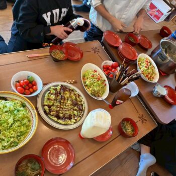今日のメニューは、ふるさと市場さんと農家さんのご協力もいただき、たくさんのキャベツとトマト