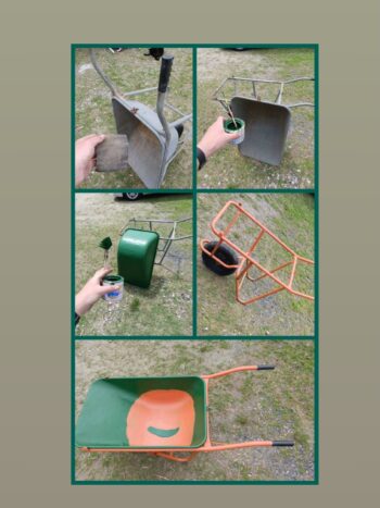 綺麗に錆を落として、ペンキを用意し、塗っていたら、こちらもサビが目立ち始めた一輪車を見つけ、これも塗っていい?と。